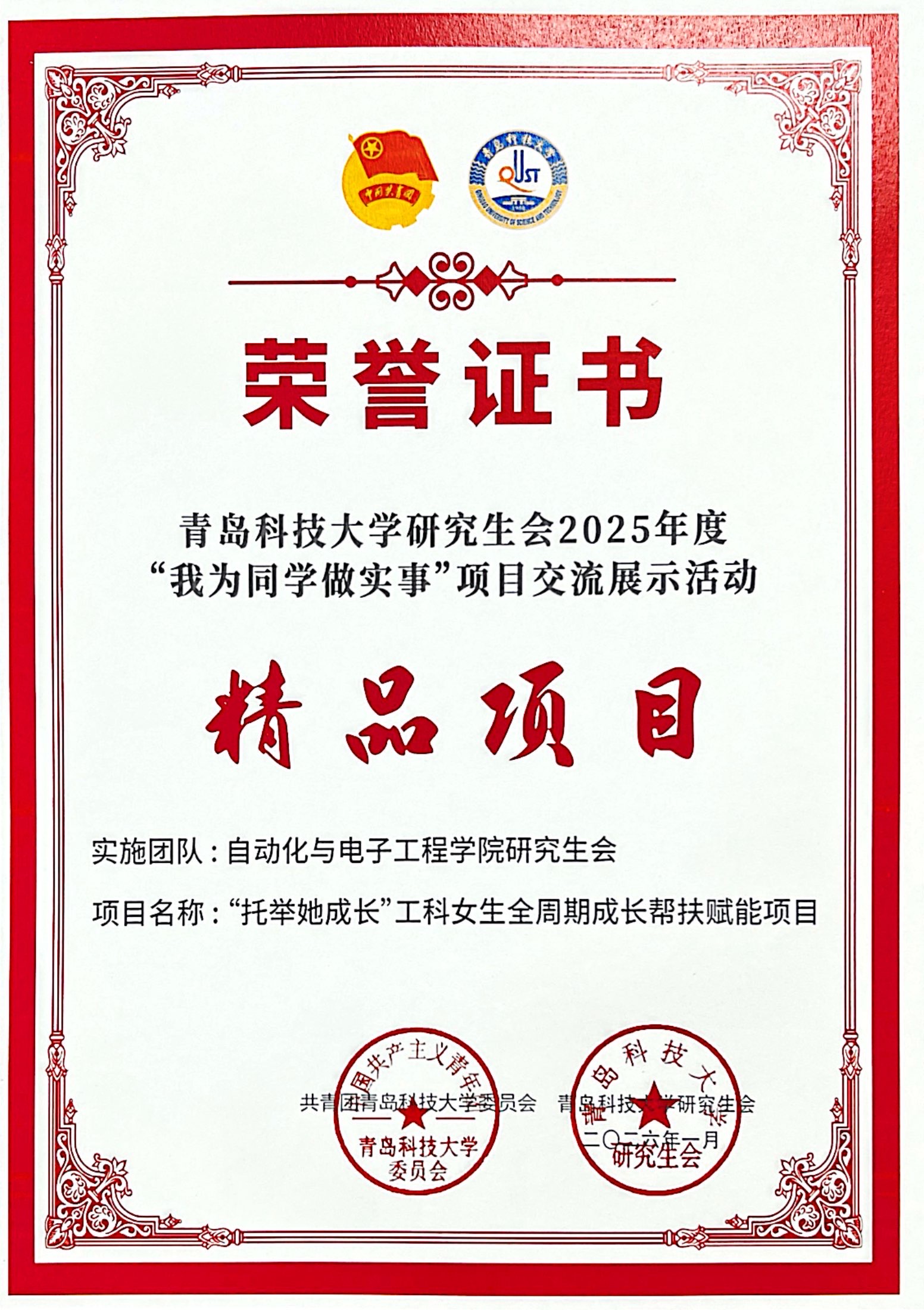 研究生会“托举她成长”工科女生全周期成长帮扶赋能项目入选年度“我为同学做实事”精品项目,以两项荣誉彰显直播app