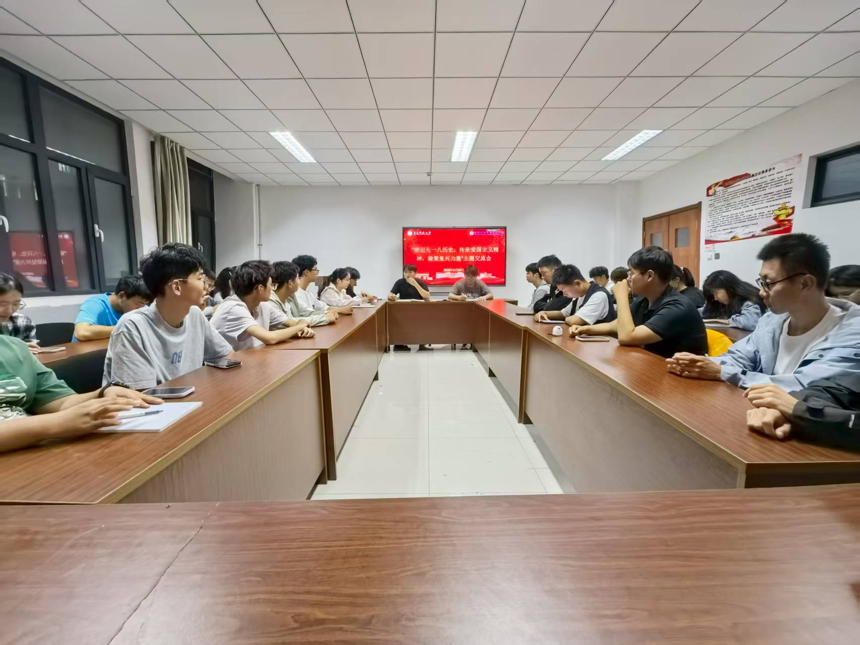 楼410会议室举办“铭记918历史,传承爱国主义精神,凝聚复兴力量”主题交流会,各年级学生代表参与活动。