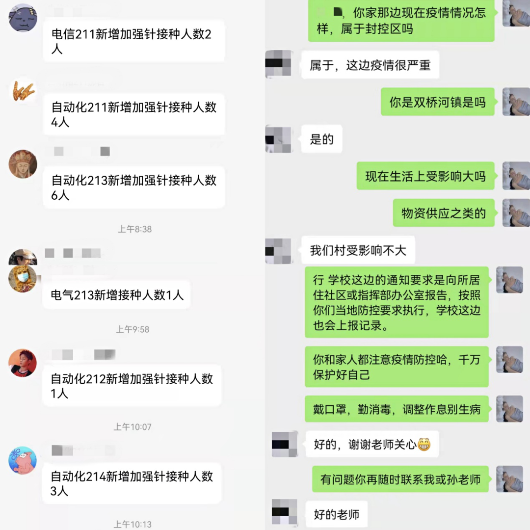 严格落实学校疫情防控要求,督促学生每日健康打卡,关注返乡学生尤其是中高风险地区学生健康状况,建立班级疫苗接种台账并实行周更新制,引导学生应种尽种加强针,做好居家防控;加强人文关怀,落实资助育人,开展2022年寒假“暖冬”线上走访活动,了解家庭经济困难学生情况,宣讲资助政策,深化“扶贫”与“扶智”有机结合,实现“AI平安”学生工作增温提效。