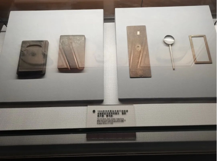 (图为1926年中共青岛支部干部联席会秘密机关使用的砚台、镇纸、放大镜、誊写版)